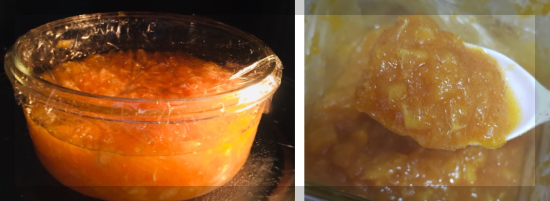 - 믹서에 간 귤과 설탕을 내열 용기에 담고 (비율 1:0.5), 랩을 씌우고 전자레인지에 8분~10분 돌립니다. (중간에 한두 번 저어주세요.) 소량 만들 때 최고입니다.