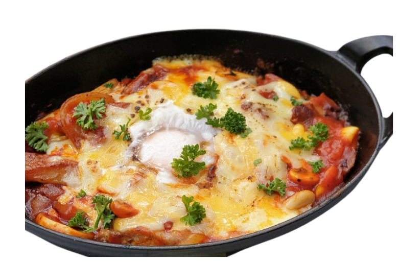 - 계란 흰자가 불투명하게 익었으면 완성입니다. 불을 끄고, 다진 파슬리나 고수를 뿌려 마무리합니다. 팬 그대로 식탁 위에 올리면, 오랫동안 따뜻함을 유지하며 근사한 분위기를 연출할 수 있습니다.
