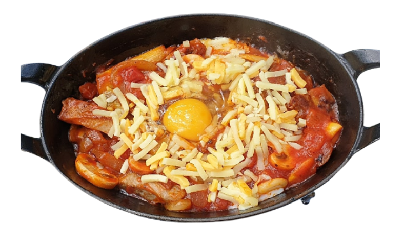 - 계란 흰자가 불투명하게 익었으면 완성입니다. 불을 끄고, 다진 파슬리나 고수를 뿌려 마무리합니다. 팬 그대로 식탁 위에 올리면, 오랫동안 따뜻함을 유지하며 근사한 분위기를 연출할 수 있습니다.