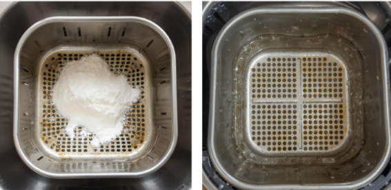 - 에어프라이어 바스켓을 싱크대에 놓고, 베이킹소다를 2~3스푼 넉넉하게 뿌려줍니다.