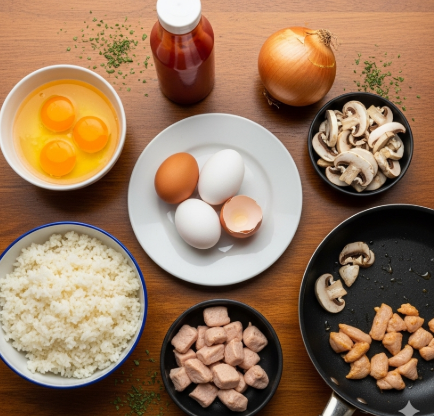 • 볶음밥 재료: 따뜻한 밥 1공기, 양파 1/4개, 당근 1/5개, 스팸이나 햄 50g, 케첩 3큰술, 굴소스 1/2큰술(선택), 소금, 후추 약간