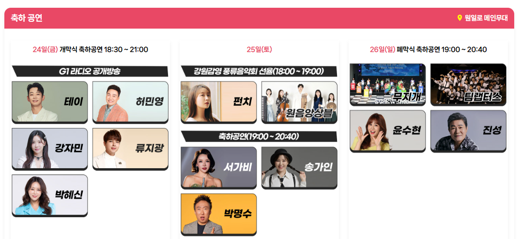 축제의 낭만을 더합니다. 또한, 매일 저녁 메인 무대에서는 축하공연이 펼쳐지는데요, 과거 축제 라인업(장윤정, 김희재, 정동원,