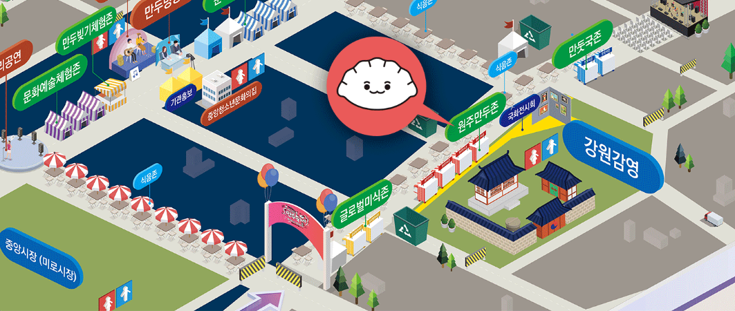 원주만두축제는 원주 중앙시장의 활성화를 위해, 남녀노소 누구나 부담 없이 즐길 수 있도록 별도의 입장권 없이,