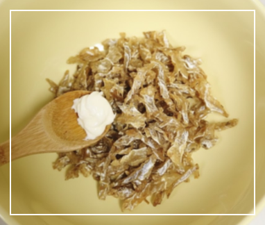 가볍게 덖은 쥐포를 볶음팬에서 덜어내어 볼에 담습니다. 쥐포가 따뜻할 때 마요네즈 1.5큰술을 넣고 조물조물 버무려주세요.