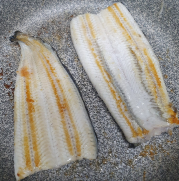 1. 달군 팬이나 석쇠에 식용유를 살짝 두르고, 손질한 장어의 껍질 부분이 바닥으로 가도록 올려줍니다.