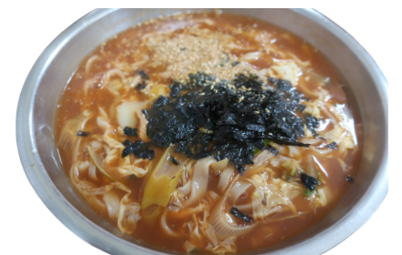 • 완성된 장칼국수를 그릇에 푸짐하게 담고, 김가루와 통깨를 듬뿍 올려 마무리합니다. 이 고명이 빠지면 진정한 장칼국수라 할 수 없습니다!