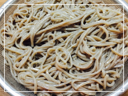 끓는 물에 메밀면을 넣고 포장에 적힌 시간(보통 4~5분)만큼 삶아줍니다.