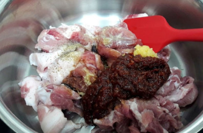 2. 즉석 양념 고추장, 다진 마늘 넣기 고기 기름에 양념 볶기