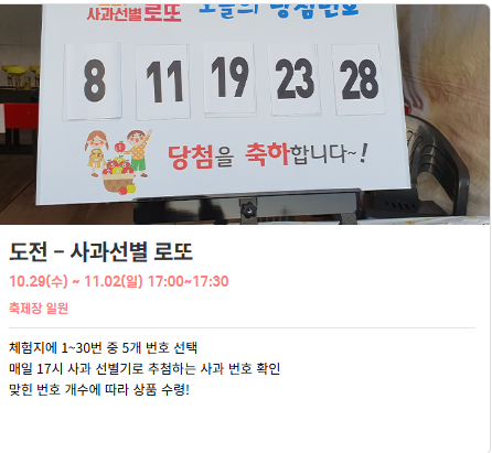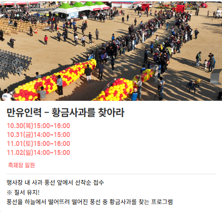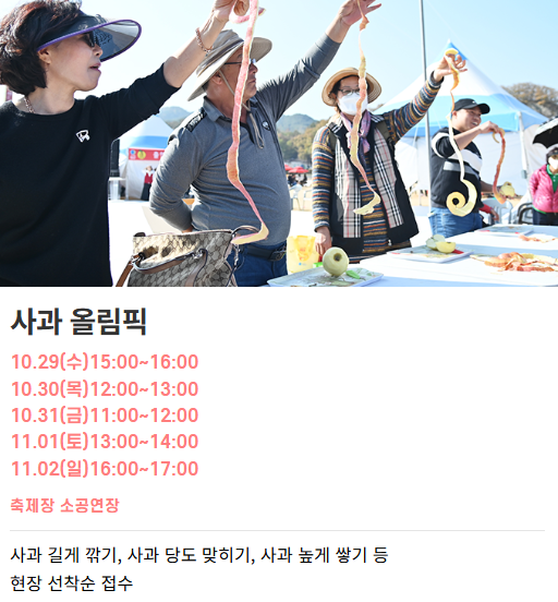 • [가장 중요!] 인기 체험 꿀팁 : 축제의 하이라이트인 **'사과따기 체험'**이나, '사과빵 만들기', '사과잼 만들기' 등 일부 인기 체험은 선착순 이므로 스피드가 생명입니다.