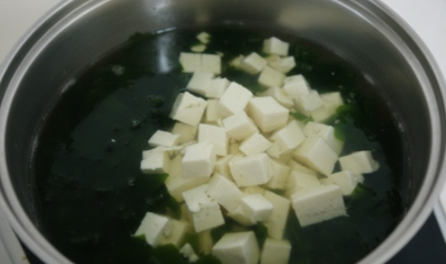 육수가 준비되면 불린 미역과 두부를 넣습니다.