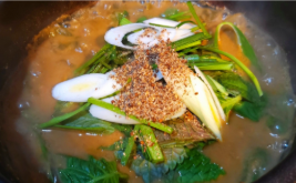 - 들깨가루를 듬뿍 풀어 농도를 맞추고, 대파, 깻, 다진 마늘을 넣어 한소끔 더 끓인 뒤 제피가루를 곁들여 완성한다.