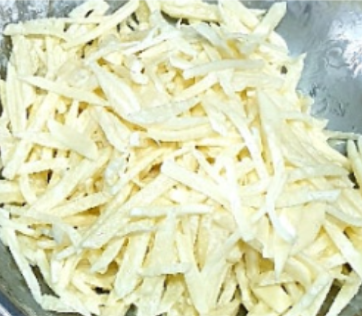 - 수분을 완벽하게 제거한 꼬들꼬들한 감자채를 넓은 볼에 담습니다.