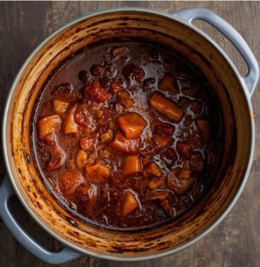 새 냄비에 옮겨 담은 음식에 두툼하게 썬 무나 감자, 또는 껍질을 벗긴 사과 1/4 조각을 넣고 다시 약불에서 끓여줍니다.