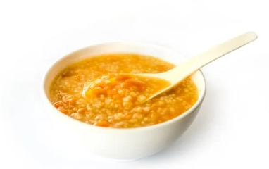 가을이 제철인 늙은 호박(또는 단호박)으로 끓여낸 노란빛의 호박죽 한 그릇.