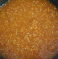 - 냄비에 호박 퓌레와 불린 쌀, 그리고 쌀뜨물(또는 물) 5~6컵을 붓습니다.