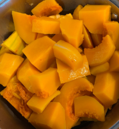 - 늙은 호박(단호박)은 껍질과 씨를 제거하고 썬 뒤, 끓는 물에 15~20분간 푹 삶는다. (쓴맛 제거를 위해 껍질 안쪽 푸른 부분까지 제거!)