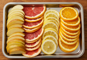 자몽, 레몬, 오렌지는 동글동글하게 0.5cm 두께로 슬라이스하고, 사과는 씨를 빼고 나뭇잎 모양이나 부채꼴로 얇게 썹니다.