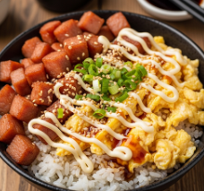따뜻한 밥 위에 볶은 스팸과 양파, 그리고 부드러운 스크램블 에그를 보기 좋게 올려줍니다.